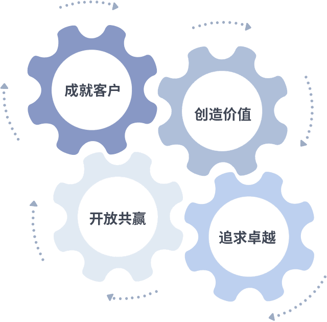 成就客户是一切决策的出发点,,,创造价值是衡量所有工作的标准,,,,追求卓越是我们做事做人的态度,,,开放共赢是我们的格局也是最终的结果。。价值观的齿轮环环相扣,,,,推动着组织里的每个人不断向前。。。。